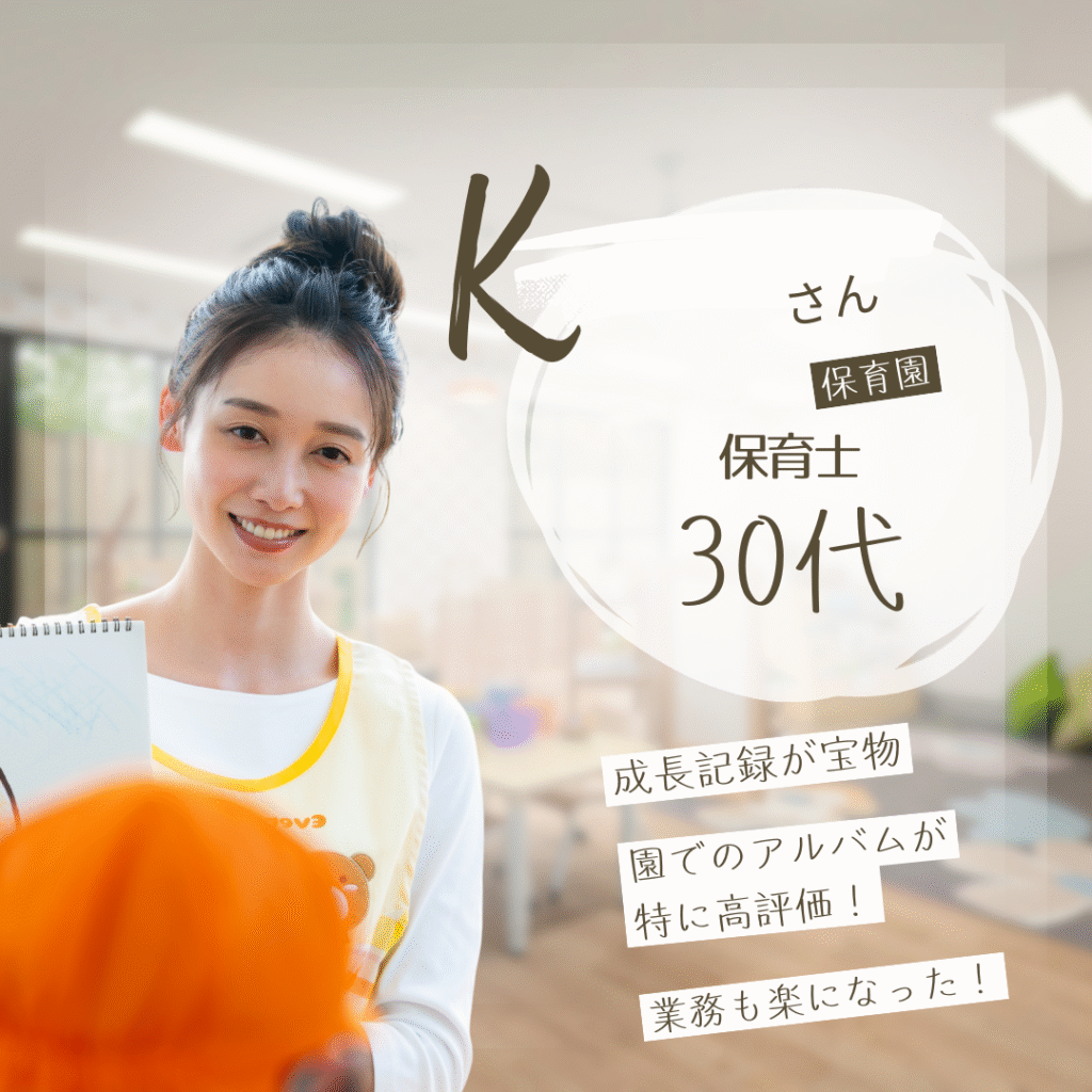 「園児の登降園記録や成長記録、園での写真を保護者様と共有することで安心と思い出を提供できる園だと高評価をいただいております」(27歳 保育士)